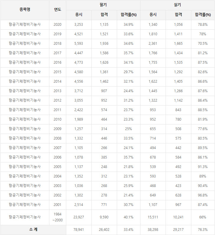 2020년까지 시행한 항공기체정비기능사 연도별 필기와 실기시험 자격검정 현황(응시인원, 합격인원, 합격률) 자료 출처는 항공기체정비기능사 자격검정 시행기관인 한국산업인력공단에서 운영하는 웹사이트 큐넷입니다.