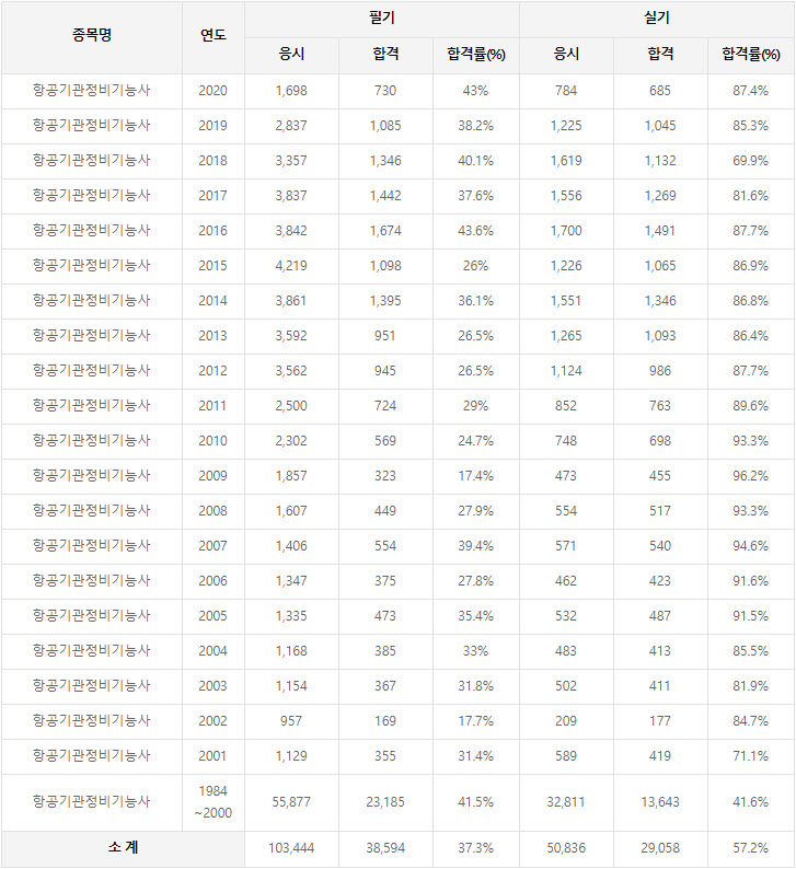 2020년까지 시행한 항공기관정비기능사 연도별 필기와 실기시험 자격검정 현황(응시인원, 합격인원, 합격률) 자료 출처는 항공기관정비기능사 자격검정 시행기관인 한국산업인력공단에서 운영하는 웹사이트 큐넷입니다.