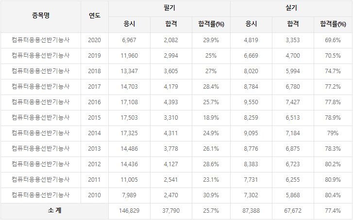2020년까지 시행한 컴퓨터응용선반기능사 연도별 필기와 실기시험 자격검정 현황(응시인원, 합격인원, 합격률) 자료 출처는 컴퓨터응용선반기능사 자격검정 시행기관인 한국산업인력공단에서 운영하는 웹사이트 큐넷입니다.