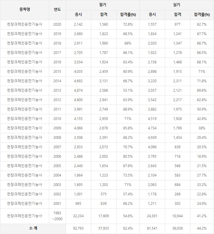 2020년까지 시행한 천장크레인운전기능사 연도별 필기와 실기시험 자격검정 현황(응시인원, 합격인원, 합격률) 자료 출처는 천장크레인운전기능사 자격검정 시행기관인 한국산업인력공단에서 운영하는 웹사이트 큐넷입니다.
