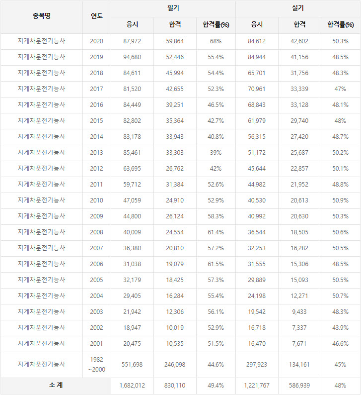2020년까지 시행한 지게차운전기능사 연도별 필기와 실기시험 자격검정 현황(응시인원, 합격인원, 합격률) 자료 출처는 지게차운전기능사 자격검정 시행기관인 한국산업인력공단에서 운영하는 웹사이트 큐넷입니다.