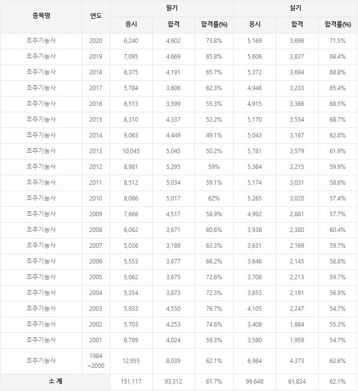 2020년까지 시행한 조주기능사 연도별 필기와 실기시험 자격검정 현황(응시인원, 합격인원, 합격률) 자료 출처는 조주기능사 자격검정 시행기관인 한국산업인력공단에서 운영하는 웹사이트 큐넷입니다.