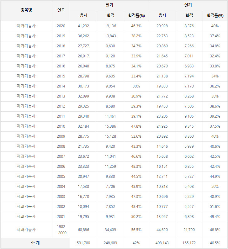 2020년까지 시행한 제과기능사 연도별 필기와 실기시험 자격검정 현황(응시인원, 합격인원, 합격률) 자료 출처는 제과기능사 자격검정 시행기관인 한국산업인력공단에서 운영하는 웹사이트 큐넷입니다.