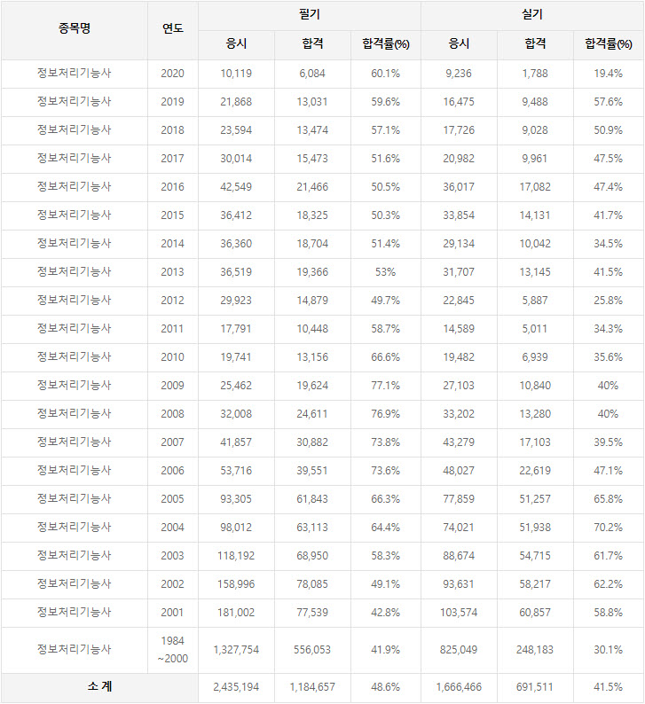 2020년까지 시행한 정보처리기능사 연도별 필기와 실기시험 자격검정 현황(응시인원, 합격인원, 합격률) 자료 출처는 정보처리기능사 자격검정 시행기관인 한국산업인력공단에서 운영하는 웹사이트 큐넷입니다.