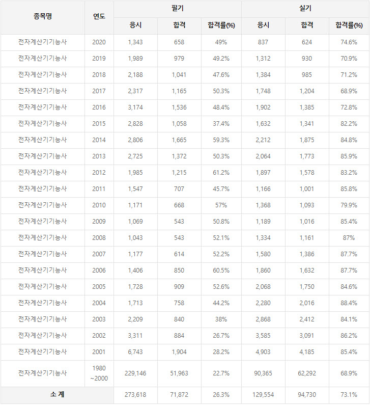 2020년까지 시행한 전자계산기기능사 연도별 필기와 실기시험 자격검정 현황(응시인원, 합격인원, 합격률) 자료 출처는 전자계산기기능사 자격검정 시행기관인 한국산업인력공단에서 운영하는 웹사이트 큐넷입니다.