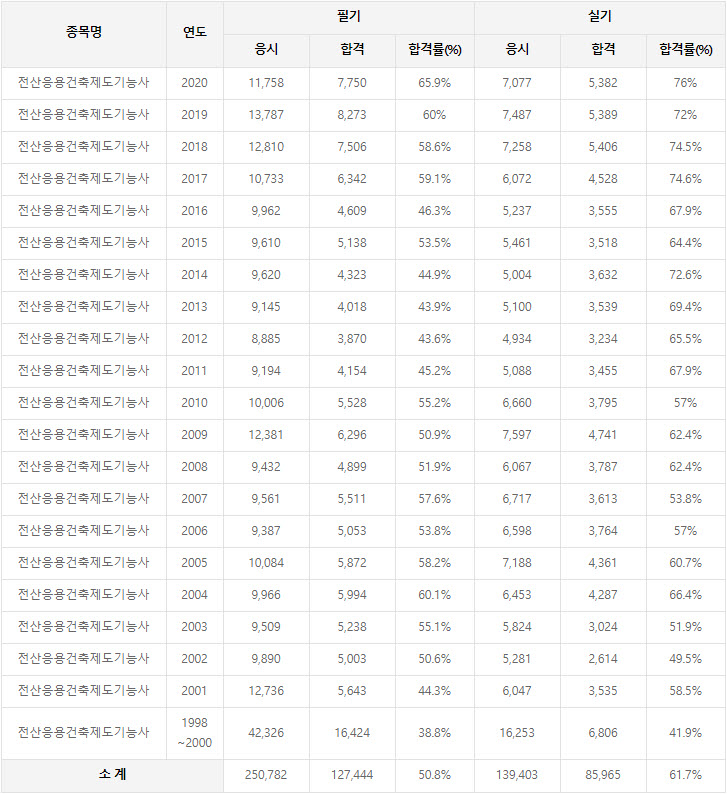 2020년까지 시행한 전산응용건축제도기능사 연도별 필기와 실기시험 자격검정 현황(응시인원, 합격인원, 합격률) 자료 출처는 전산응용건축제도기능사 자격검정 시행기관인 한국산업인력공단에서 운영하는 웹사이트 큐넷입니다.