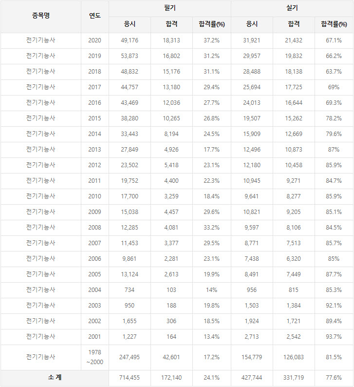 2020년까지 시행한 전기기능사 연도별 필기와 실기시험 자격검정 현황(응시인원, 합격인원, 합격률) 자료 출처는 전기기능사 자격검정 시행기관인 한국산업인력공단에서 운영하는 웹사이트 큐넷입니다.