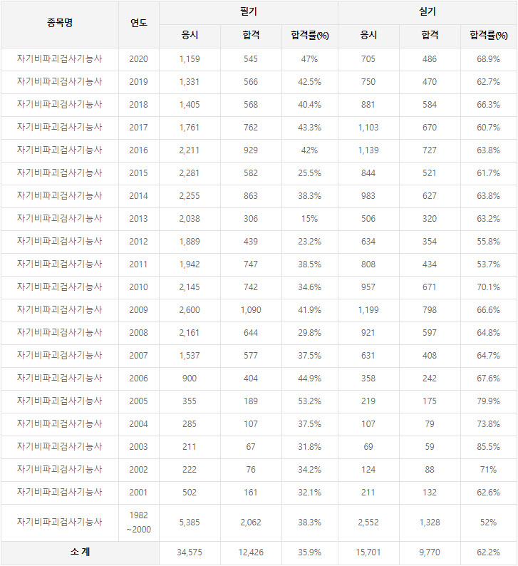 2020년까지 시행한 자기비파괴검사기능사 연도별 필기와 실기시험 자격검정 현황(응시인원, 합격인원, 합격률) 자료 출처는 자기비파괴검사기능사 자격검정 시행기관인 한국산업인력공단에서 운영하는 웹사이트 큐넷입니다.