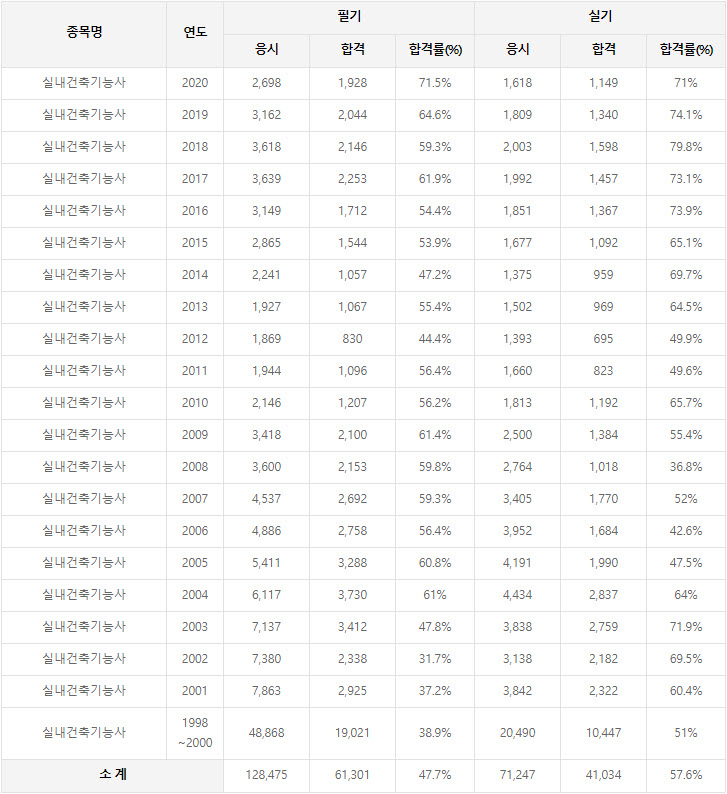 2020년까지 시행한 실내건축기능사 연도별 필기와 실기시험 자격검정 현황(응시인원, 합격인원, 합격률) 자료 출처는 실내건축기능사 자격검정 시행기관인 한국산업인력공단에서 운영하는 웹사이트 큐넷입니다.