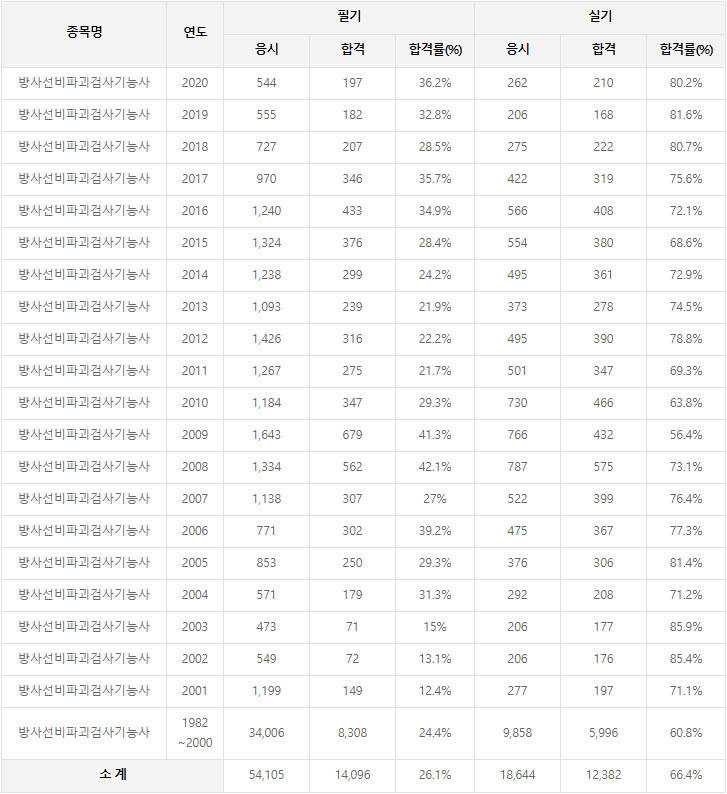2020년까지 시행한 방사선비파괴검사기능사 연도별 필기와 실기시험 자격검정 현황(응시인원, 합격인원, 합격률) 자료 출처는 방사선비파괴검사기능사 자격검정 시행기관인 한국산업인력공단에서 운영하는 웹사이트 큐넷입니다.