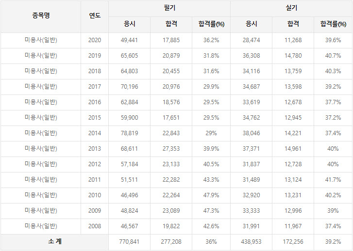 2020년까지 시행한 미용사(일반) 연도별 필기와 실기시험 자격검정 현황(응시인원, 합격인원, 합격률) 자료 출처는 미용사(일반) 자격검정 시행기관인 한국산업인력공단에서 운영하는 웹사이트 큐넷입니다.