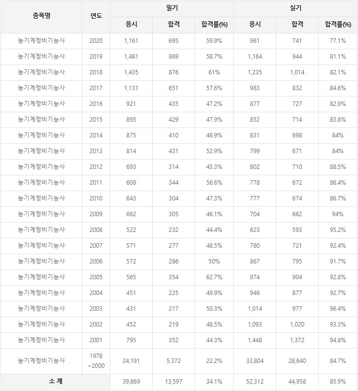 2020년까지 시행한 농기계정비기능사 연도별 필기와 실기시험 자격검정 현황(응시인원, 합격인원, 합격률) 자료 출처는 농기계정비기능사 자격검정 시행기관인 한국산업인력공단에서 운영하는 웹사이트 큐넷입니다.