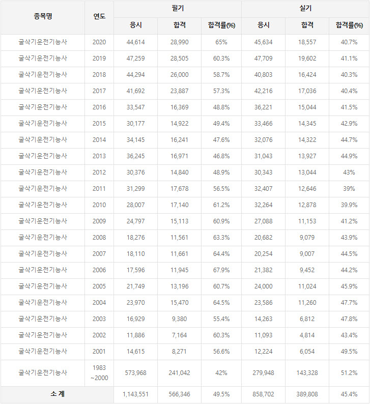 2020년까지 시행한 굴삭기운전기능사 연도별 필기와 실기시험 자격검정 현황(응시인원, 합격인원, 합격률) 자료 출처는 굴삭기운전기능사 자격검정 시행기관인 한국산업인력공단에서 운영하는 웹사이트 큐넷입니다.