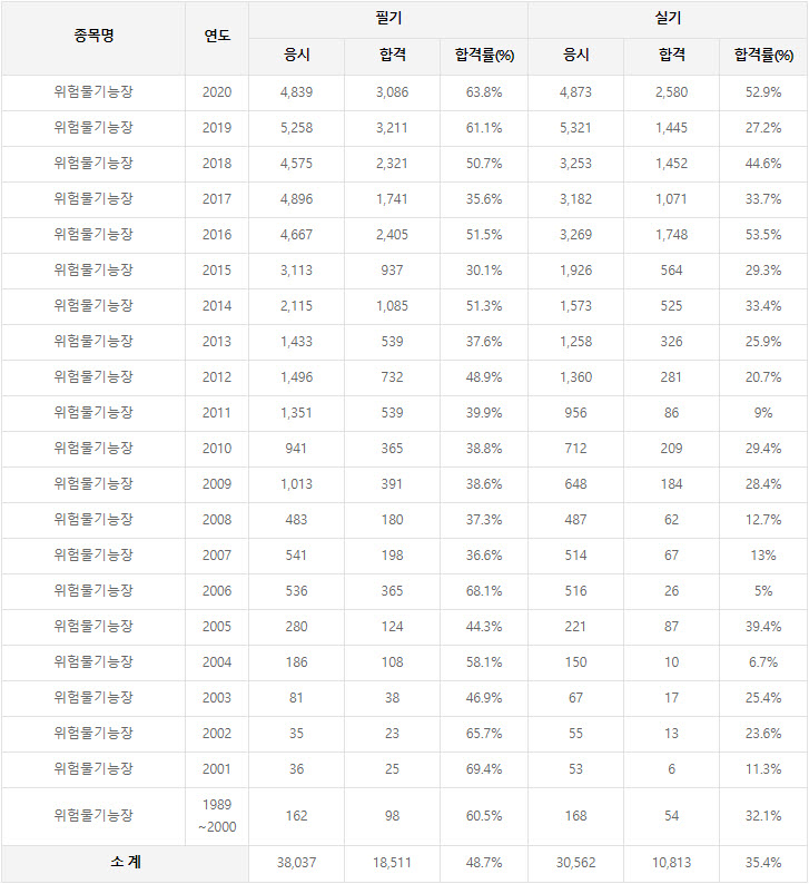 2020년까지 시행한 위험물기능장 연도별 필기와 실기시험 자격검정 현황(응시인원, 합격인원, 합격률) 자료 출처는 위험물기능장 자격검정 시행기관인 한국산업인력공단에서 운영하는 웹사이트 큐넷입니다.