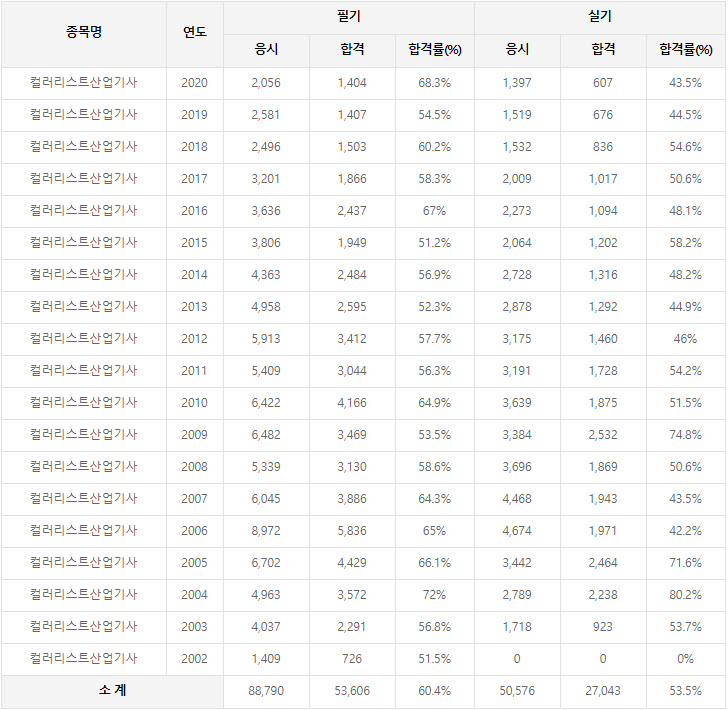 2020년까지 시행한 컬러리스트산업기사 연도별 필기와 실기시험 자격검정 현황(응시인원, 합격인원, 합격률) 자료 출처는 컬러리스트산업기사 자격검정 시행기관인 한국산업인력공단에서 운영하는 웹사이트 큐넷입니다.