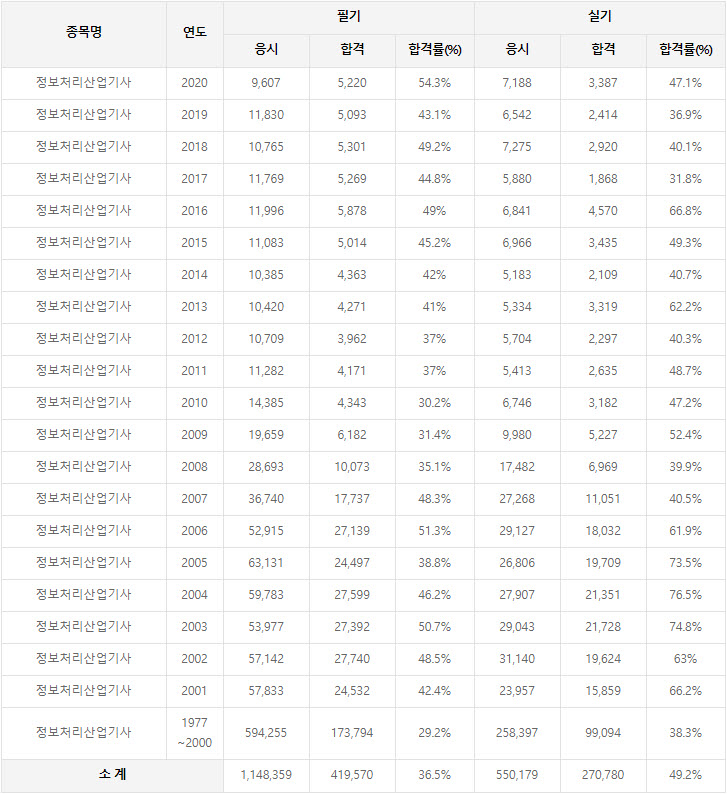 2020년까지 시행한 정보처리산업기사 연도별 필기와 실기시험 자격검정 현황(응시인원, 합격인원, 합격률) 자료 출처는 정보처리산업기사 자격검정 시행기관인 한국산업인력공단에서 운영하는 웹사이트 큐넷입니다.