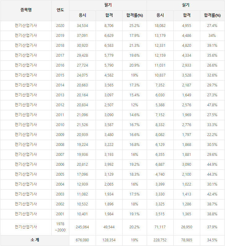 2020년까지 시행한 전기산업기사 연도별 필기와 실기시험 자격검정 현황(응시인원, 합격인원, 합격률) 자료 출처는 전기산업기사 자격검정 시행기관인 한국산업인력공단에서 운영하는 웹사이트 큐넷입니다.