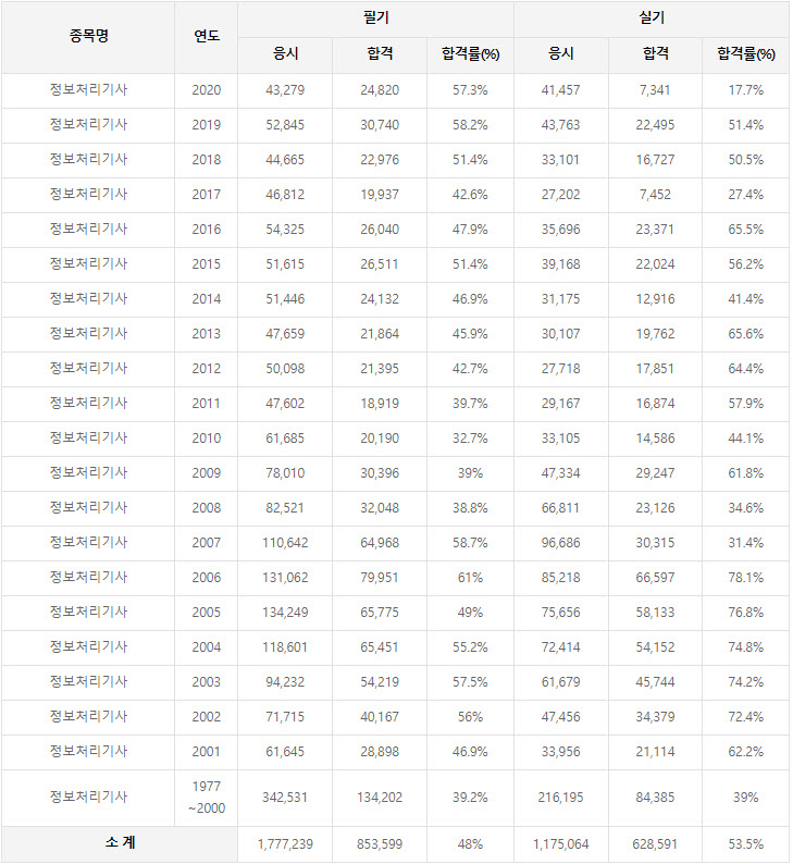2020년까지 시행한 정보처리기사 연도별 필기와 실기시험 자격검정 현황(응시인원, 합격인원, 합격률) 자료 출처는 정보처리기사 자격검정 시행기관인 한국산업인력공단에서 운영하는 웹사이트 큐넷입니다.