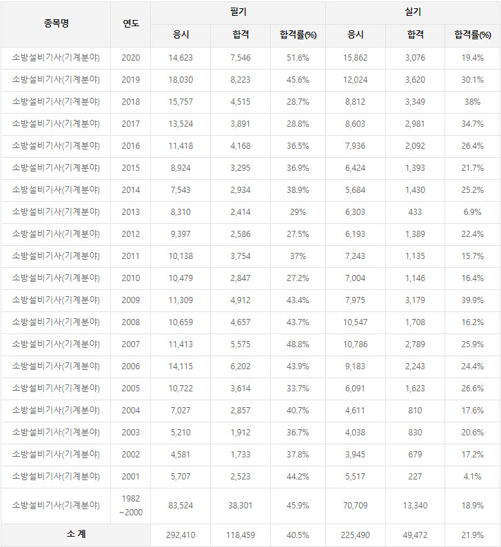 2020년까지 시행한 소방설비기사(기계분야) 연도별 필기와 실기시험 자격검정 현황(응시인원, 합격인원, 합격률) 자료 출처는 소방설비기사(기계분야) 자격검정 시행기관인 한국산업인력공단에서 운영하는 웹사이트 큐넷입니다.