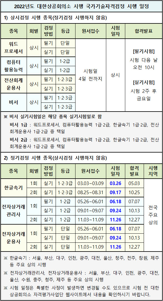 [시험일정] 2022년 대한상공회의소 시행 국가기술자격 모든 종목 시험 일정 (↓)