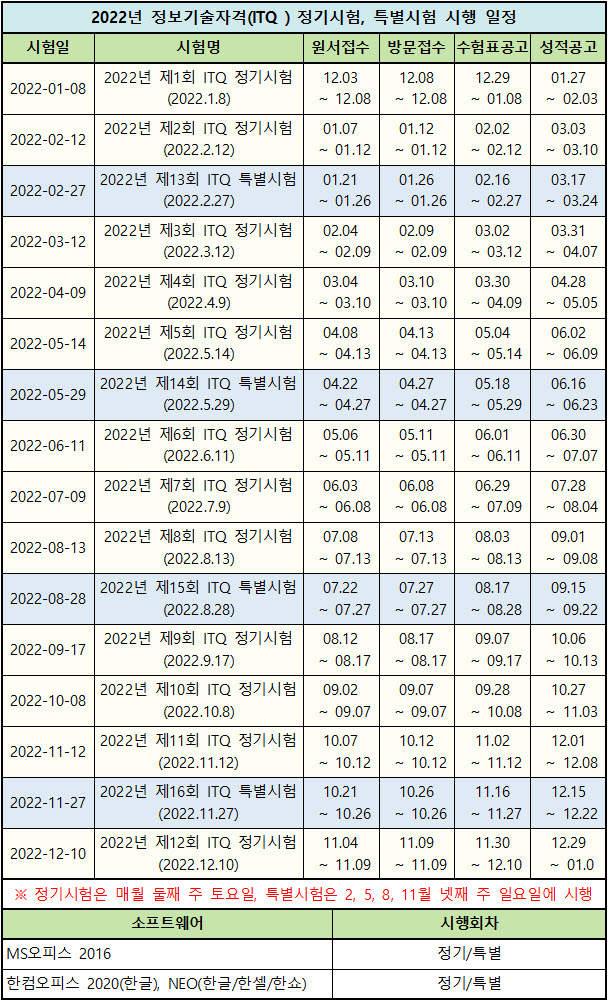 2022년 정보기술자격(ITQ) 자격검정 시험 일정 (한국생산성본부 시행)