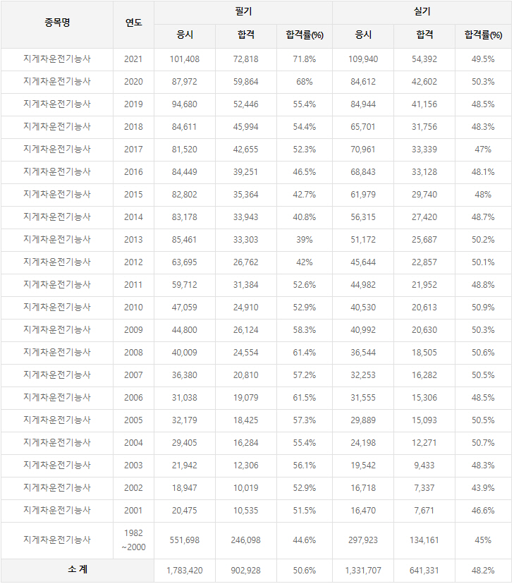 2021년까지 시행한 지게차운전기능사 연도별 필기와 실기시험 자격검정 현황(응시인원, 합격인원, 합격률) 자료 출처는 한국산업인력공단에서 운영하는 웹사이트 큐넷(q-net.or.kr)입니다.