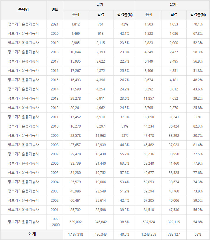 2021년까지 시행한 정보기기운용기능사 연도별 필기와 실기시험 자격검정 현황(응시인원, 합격인원, 합격률) 자료 출처는 한국산업인력공단에서 운영하는 웹사이트 큐넷(q-net.or.kr)입니다.