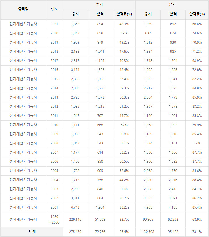2021년까지 시행한 전자계산기기능사 연도별 필기와 실기시험 자격검정 현황(응시인원, 합격인원, 합격률) 자료 출처는 한국산업인력공단에서 운영하는 웹사이트 큐넷(q-net.or.kr)입니다.