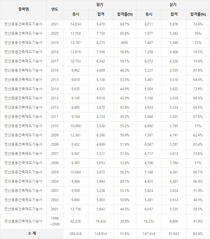 2021년까지 시행한 전산응용건축제도기능사 연도별 필기와 실기시험 자격검정 현황(응시인원, 합격인원, 합격률) 자료 출처는 한국산업인력공단에서 운영하는 웹사이트 큐넷(q-net.or.kr)입니다.