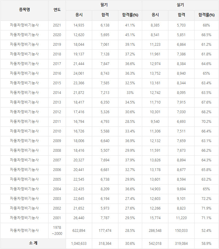2021년까지 시행한 자동차정비기능사 연도별 필기와 실기시험 자격검정 현황(응시인원, 합격인원, 합격률) 자료 출처는 한국산업인력공단에서 운영하는 웹사이트 큐넷(q-net.or.kr)입니다.