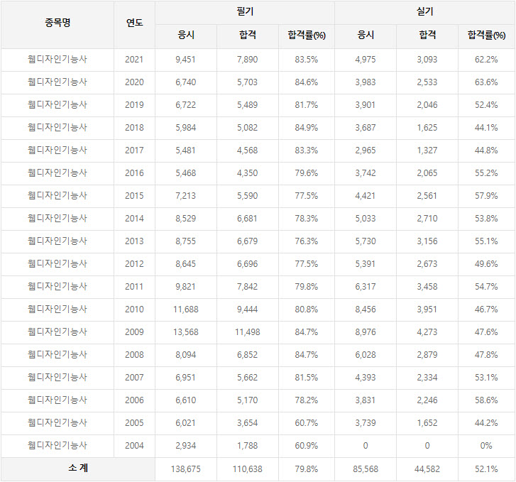 2021년까지 시행한 웹디자인기능사 연도별 필기와 실기시험 자격검정 현황(응시인원, 합격인원, 합격률) 자료 출처는 한국산업인력공단에서 운영하는 웹사이트 큐넷(q-net.or.kr)입니다.