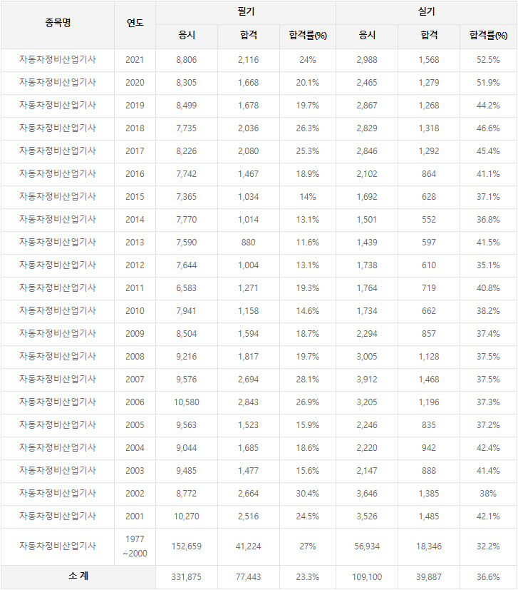 2021년까지 시행한 자동차정비산업기사 연도별 필기와 실기시험 자격검정 현황(응시인원, 합격인원, 합격률) 자료 출처는 한국산업인력공단에서 운영하는 웹사이트 큐넷(q-net.or.kr)입니다.