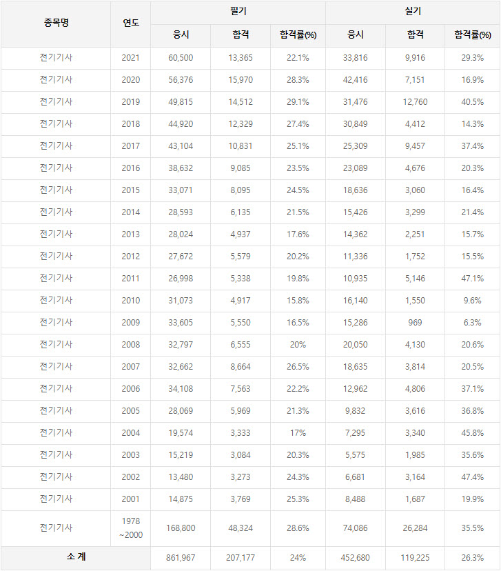 2021년까지 시행한 전기기사 연도별 필기와 실기시험 자격검정 현황(응시인원, 합격인원, 합격률) 자료 출처는 한국산업인력공단에서 운영하는 웹사이트 큐넷(q-net.or.kr)입니다.