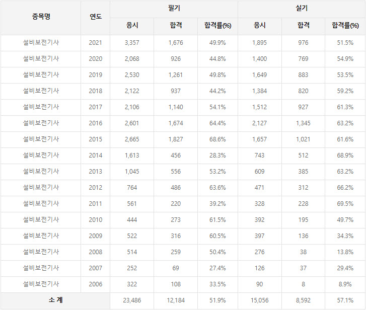 2021년까지 시행한 설비보전기사 연도별 필기와 실기시험 자격검정 현황(응시인원, 합격인원, 합격률) 자료 출처는 한국산업인력공단에서 운영하는 웹사이트 큐넷(q-net.or.kr)입니다.