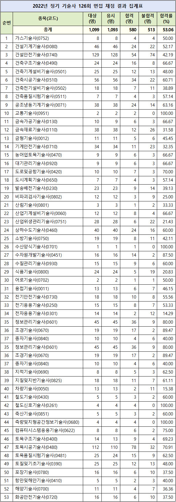 한국산업인력공단 2022년 시행 126회 기술사 면접시험 현황 자료를 살펴보면 전체 시험종목 41개 종목에 원서를 접수한 대상인원 1,099명 중 1,093명이 응시하여 580명이 합격하고, 513명이 불합격하여 53.06%의 합격률을 나타내고 있음을 확인할 수 있습니다.