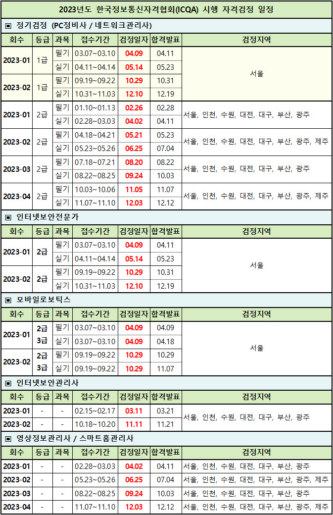 ExamSchedules 2022. 12. 8. 18:18한국정보통신자격협회(ICQA) 시행 자격 네트워크관리사(1급, 2급), PC정비사(1급, 2급)를 포함한 2023년 시행 주요 종목 자격검정 일정이 기재된 첨부 파일과 첨부 파일 내용을 편집하여 작성한 일정표를 게재합니다.
