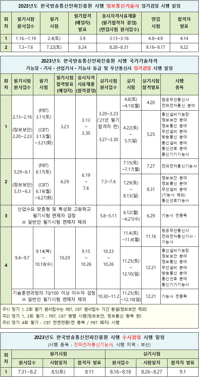 2023년도 한국방송통신전파진흥원 시행 정보통신 직무분야 국가기술자격검정 시행 일정