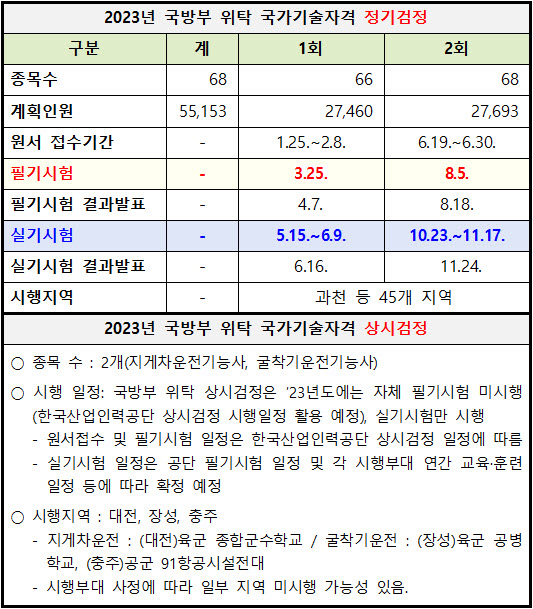 2023년 국방부 위탁 국가기술자격검정 시행 일정 (정기검정 68종목, 상시검정 2종목)