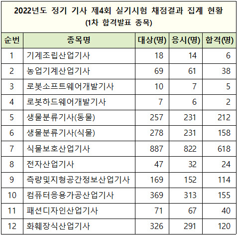 한국산업인력공단 시행 2022년 4회 기능·기술 분야 기사, 산업기사 등급 및 서비스 분야 국가기술자격 실기시험 종목 중 1차 합격 발표 종목 응시현황 자료(대상인원, 응시인원, 합격인원)를 게재합니다.