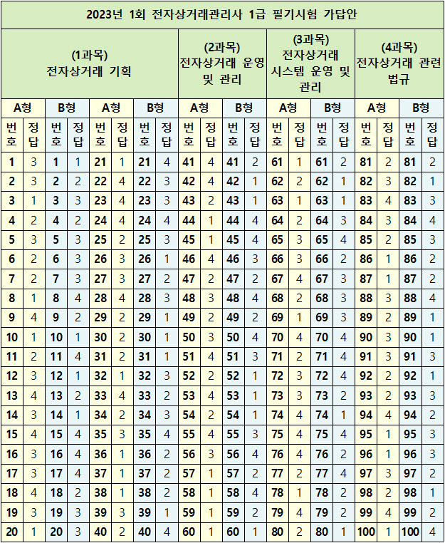 2023년 1회 전자상거래관리사 1급과 2급 필기시험은 6얼 17일 시행되었고, 가답안과 기출문제 출처는 자격평가사업단 웹사이트입니다.