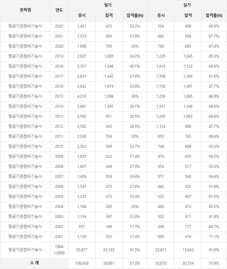 2022년까지 시행한 항공기관정비기능사 연도별 필기와 실기시험 자격검정 현황(응시인원, 합격인원, 합격률) 자료 출처는 한국산업인력공단에서 운영하는 웹사이트 큐넷(q-net.or.kr)입니다.