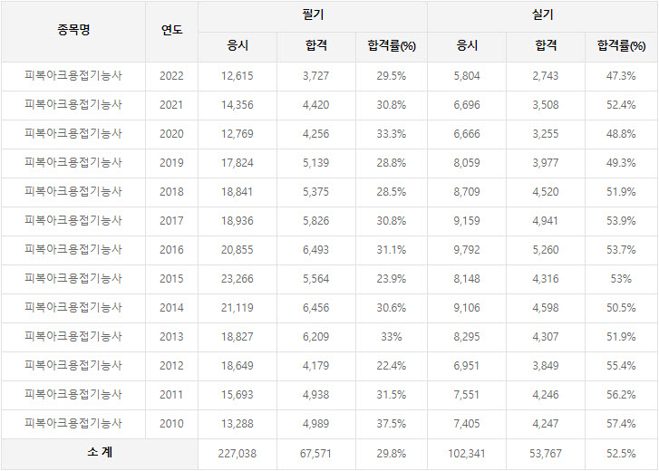 2022년까지 시행한 피복아크용접기능사 연도별 필기와 실기시험 자격검정 현황(응시인원, 합격인원, 합격률) 자료 출처는 한국산업인력공단에서 운영하는 웹사이트 큐넷(q-net.or.kr)입니다.