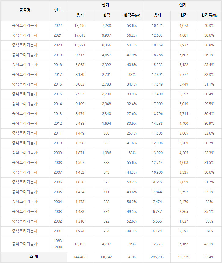 2022년까지 시행한 중식조리기능사 연도별 필기와 실기시험 자격검정 현황(응시인원, 합격인원, 합격률) 자료 출처는 한국산업인력공단에서 운영하는 웹사이트 큐넷(q-net.or.kr)입니다.