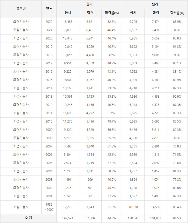 2022년까지 시행한 조경기능사 연도별 필기와 실기시험 자격검정 현황(응시인원, 합격인원, 합격률) 자료 출처는 한국산업인력공단에서 운영하는 웹사이트 큐넷(q-net.or.kr)입니다.