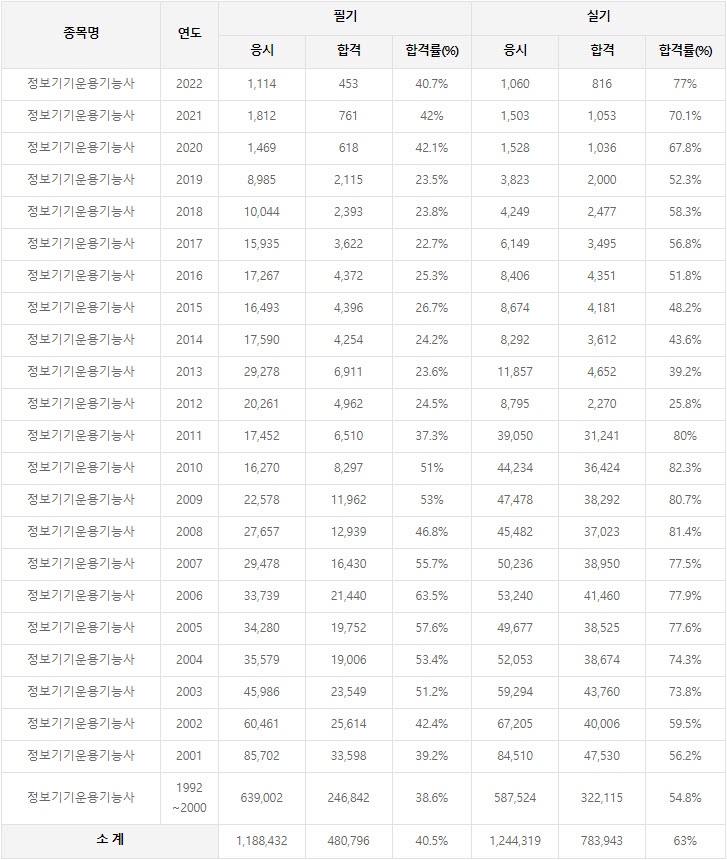 2022년까지 시행한 정보기기운용기능사 연도별 필기와 실기시험 자격검정 현황(응시인원, 합격인원, 합격률) 자료 출처는 한국산업인력공단에서 운영하는 웹사이트 큐넷(q-net.or.kr)입니다.