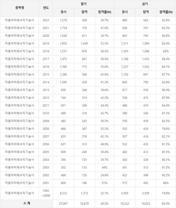 2022년까지 시행한 자동차차체수리기능사 연도별 필기와 실기시험 자격검정 현황(응시인원, 합격인원, 합격률) 자료 출처는 한국산업인력공단에서 운영하는 웹사이트 큐넷(q-net.or.kr)입니다.