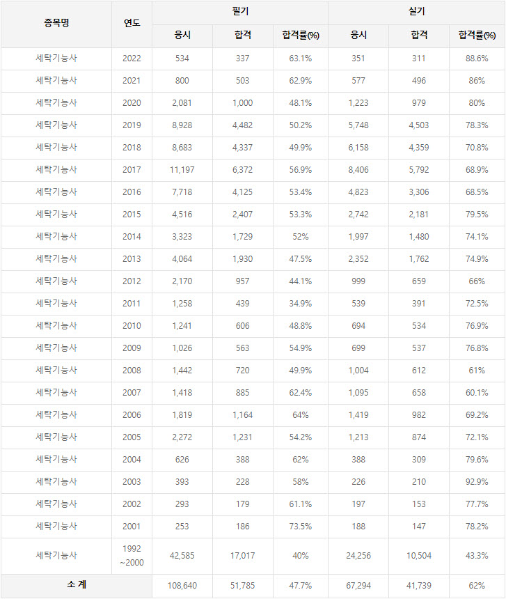 2022년까지 시행한 세탁기능사 연도별 필기와 실기시험 자격검정 현황(응시인원, 합격인원, 합격률) 자료 출처는 한국산업인력공단에서 운영하는 웹사이트 큐넷(q-net.or.kr)입니다.