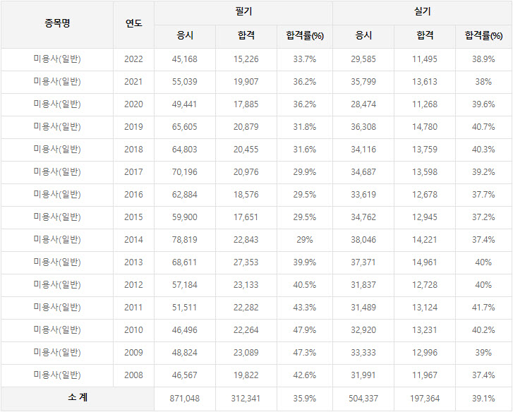 2022년까지 시행한 미용사(일반) 연도별 필기와 실기시험 자격검정 현황(응시인원, 합격인원, 합격률) 자료 출처는 한국산업인력공단에서 운영하는 웹사이트 큐넷(q-net.or.kr)입니다.