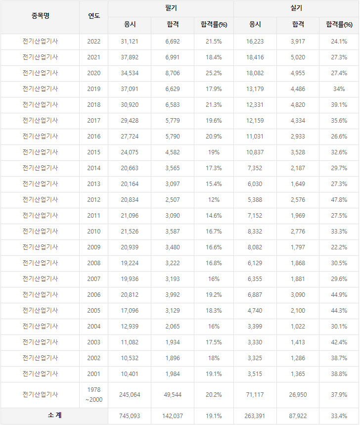 2022년까지 시행한 전기산업기사 연도별 필기와 실기시험 자격검정 현황(응시인원, 합격인원, 합격률) 자료 출처는 한국산업인력공단에서 운영하는 웹사이트 큐넷(q-net.or.kr)입니다.