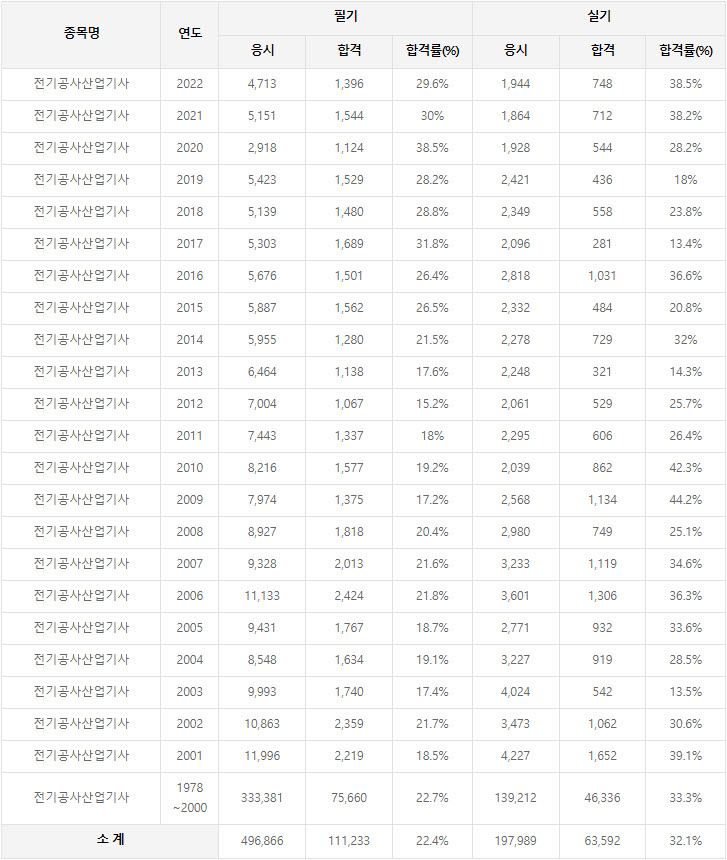 2022년까지 시행한 전기공사산업기사 연도별 필기와 실기시험 자격검정 현황(응시인원, 합격인원, 합격률) 자료 출처는 한국산업인력공단에서 운영하는 웹사이트 큐넷(q-net.or.kr)입니다.